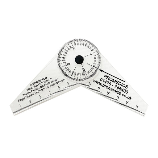 Economical, transparent goniometer. Made of clear plastic. Measure the range of motion of wrists and digits. Goniometer measures 15cm long. Ruler h...