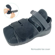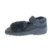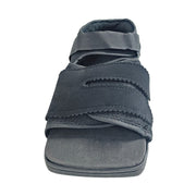 The square toe configuration of the Jura Post- Op Shoe offers protection and improved fit/accommodation. The rocker-sole profile aids gait and reduces forces on foot. Outsole is non-slip and material composition provides reduced movement under the metatarsal heads. Simple closure system allows for additional dressings. Insole can be removed for alteration, improved accommodation or fitting ‘Off-Loading Insole’. Toe cover can be removed if required.
