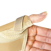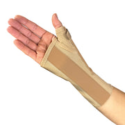 A wrist thumb orthosis with malleable aluminium thumb stay to hold the thumb firmly in abduction, supporting the thumb MP joint and restricting movement at the CMC joint.