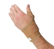One-way stretch elastic supports the wrist and thumb, leaving the palm completely free. An 11cm removable flexible thumb stay restricts movement at the CMC and MCP joints, leaving the IP joint free. Angled hook/loop attachment at wrist and thumb ensures perfect fit.