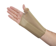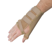 An elastic wrist brace incorporating a padded malleable aluminium thumb stay. Holds the thumb firmly in abduction, supporting the thumb MP joint and restricting movement at the CMC joint.