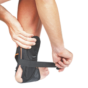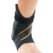Ankle brace for limiting pro- and supination. Thin breath-o-prene structure with padded medial and lateral shells. Additional rear padding for improved comfort. Circular strap for limiting talar shift can be shortened.
