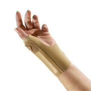 A Neoprene thumb spica featuring a removable flexible stay which restricts movement at the CMC and MCP joints, leaving the IP joint free.